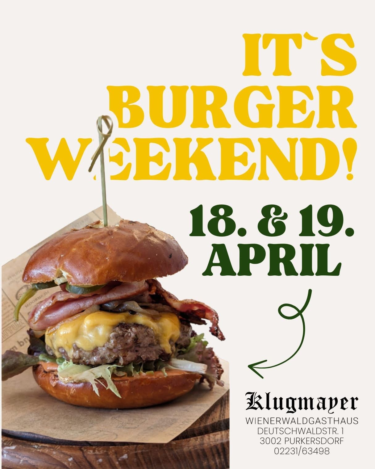 Burger Burger Weekend Gasthaus Klugmayer Lokale Purkersdorf Menüpläne Purkersdorf Purkersdorf Burger Weekend beim Klugmayer! admin 14 April, 2026 Keine Kommentare